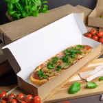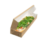 Pudełko na zapiekankę o wymiarach 380x110x50 mm. Wykonane z brązowego kartonu, bez nadruku. Tego typu opakowanie jest idealne zarówno dla restauracji oferujących dania na wynos.